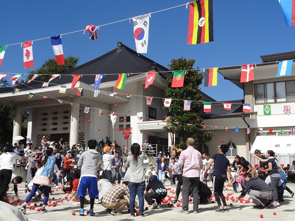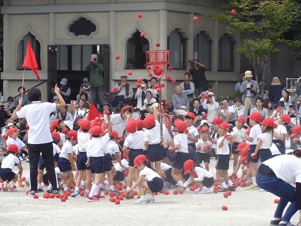 PTA競技 今年は玉入れ。大勢の保護者の皆様が集まってくれました。子どもたちも力一杯応援。