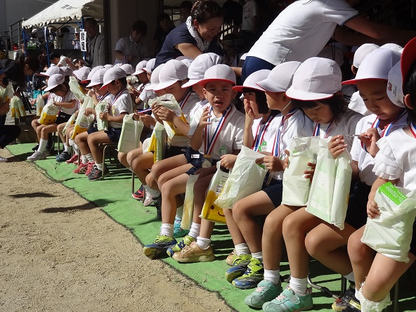 運動会最後は年中・年長選手によるリレー ご褒美をもらい頑張った一日が終わりました。