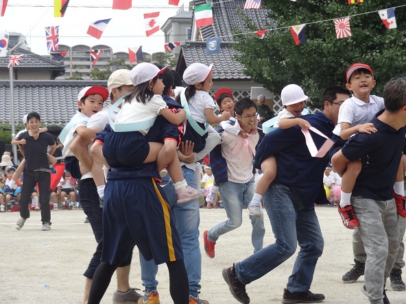2歳児のかけっこ 風車を取ってゴールまで 年長親子競技『紅白騎馬戦』
