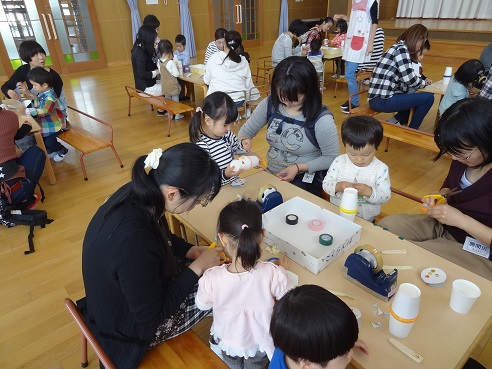 紙コップのマラカス作り。カラーテープで模様を付けました。お母さんが丸や三角に切ってくれるので、それをペタペタ貼り付けたり、自分で切ってみたり・・・時間をかけてじっくりと取り組んでいましたよ。