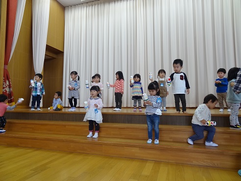 ステージで合奏の発表会ごっこ。自分で作った楽器が嬉しいようでした。