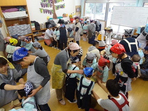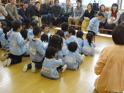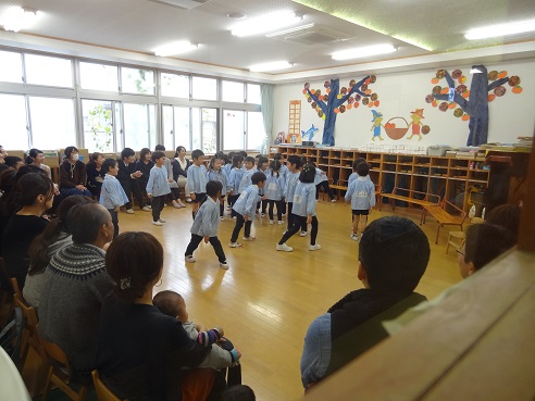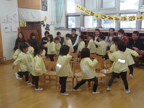 年中さんは耳と集中力とを発揮して遊んでいました。「人数集め」「伝言ゲーム」など、友だちと一緒に考えたり協力したりしている姿などを見ていただいていたようです。