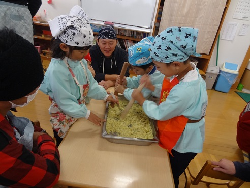 年長さんは先日収穫したさつまいもを使った調理を、保護者の応援を得ながら行いました。つくるものはサツマイモを使ったお菓子「茶巾絞り」だそうです。