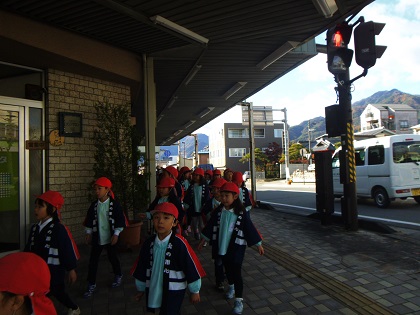 防火意識を持った子どもたちは、園周辺を防火への啓蒙活動で回りました。幼年消防クラブの年長さん達です。