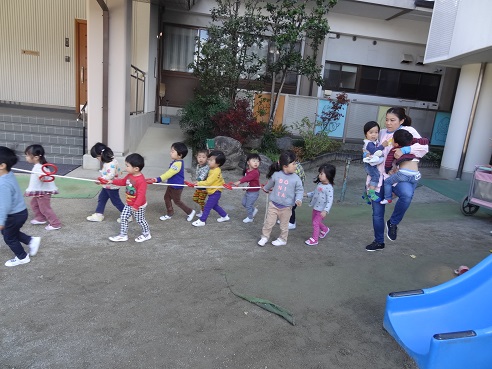 火災発生発見後、消防署直通電話で“通報訓練”今回は給食室の先生。非常ベルと館内放送を聞き、全園児園庭に避難。園庭で遊んでいた園児は建物から離れたところに避難集合。