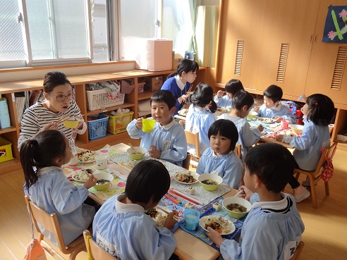 各クラスでのお祝いの後、保護者の皆様には保育参加していただき、「お母さん先生」として、配膳や給食指導、午後の遊びを見ていただきました。