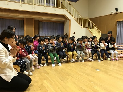2歳児の小さなお友だちも、先生と一緒に遊戯室に集まってお参りをしたり、園長先生からお釈迦様のお話を聞いたりしました。