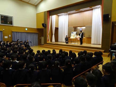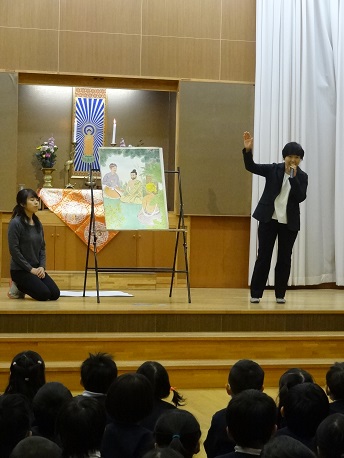 いつもの集会と違い、少し暗い遊戯室になっていて、子どもたちは静かな気持ちで園長先生から、お釈迦様がお悟りを開かれたお話を聞きました。