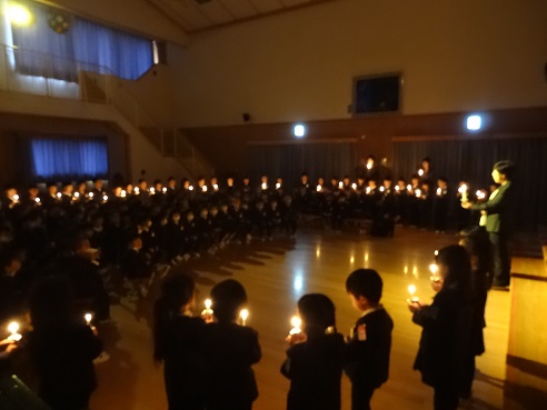最後に年長さんのキャンドルサービスがありました。園長先生が御仏様からいただいたお灯りは、先生方へ、そして年長さんへと広がっていき、年中さんや年少さんをあたたかな光の輪で包み、みんなで成道会のうたを歌いました。