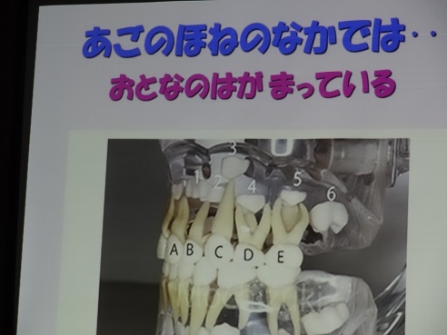 年長の頃になると生えてくる「6歳臼歯」について知りました。口の中の一番奥に、知らないうちにゆっくりと生えてくるので、乳歯の奥歯だけ磨いている内に、生えきったときには既に虫歯になっていることもあるのだそうです。6歳臼歯だけにブラシを当てて磨く方法も教えていただきました。