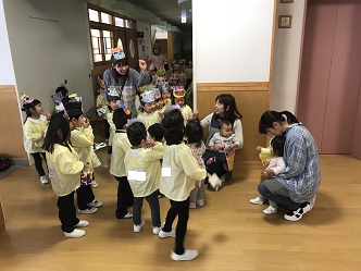 1歳児さんは鬼のバッグを作って豆を入れ、鬼退治に園内を回っていました。まだこの時間は大きな子たちは外で雪遊びをしていたので、逆に安心して(?)回っていられたようでした。