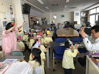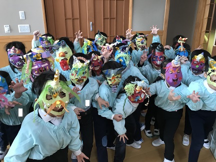 年長さんが作った鬼のお面は凄みがあって、集団で鬼を表現されるとちょっと怖い・・・乱入された2歳児さんのお部屋では思わず泣き出してしまう小さなお友だちが続出。「泣いてる赤鬼」がいっぱい。
