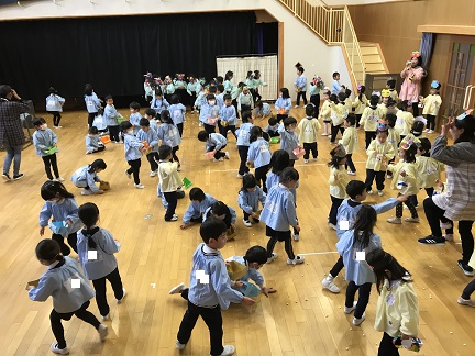 遊戯室では年中さんの豆まきに年少・年長児たちが次々と乱入し、大騒ぎになっていました。