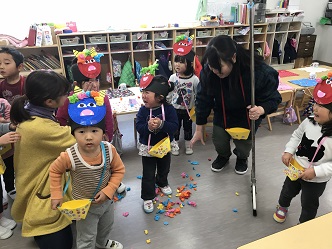 遊戯室も、廊下も、保育室もどこもかしこもたくさんのちびっこ鬼が暴れていましたが、お互いに「鬼はー外、福はー内」と豆をまきあい、自分の中にいる鬼を追い出していました。