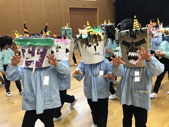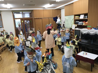 年中さんは紙袋で作ったお面をすっぽりかぶって、恐そうな鬼になりきって練り歩いていました。