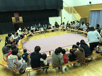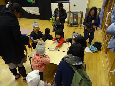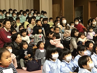 人形劇の後、皆さんで丸くなっておやつをいただきました。お別れに担当者からペンダントのプレゼント。3歳のさくらんぼさん達は、春から様々な園に入園していきます。みんな元気に大きくなってくださいね。