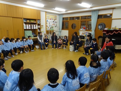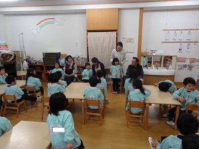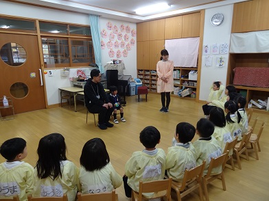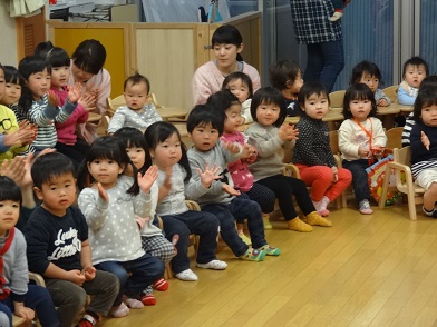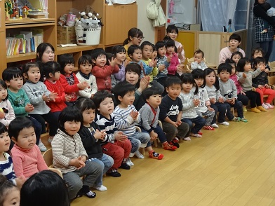 手をたたきながら、一緒に口ずさみながら、歌とペープサートを楽しんでいました。未満児さん達も随分と落ち着いて参加できるまでに成長していました。