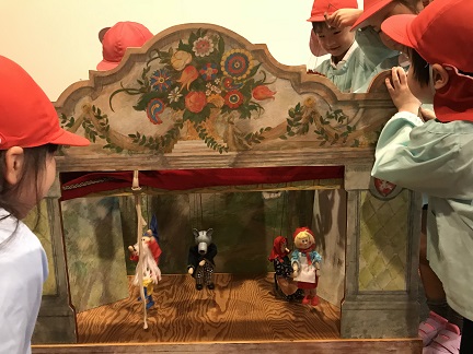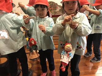 糸操りの人形にも触れました。舞台で人形を動かして「人形劇」の雰囲気を楽しんでいました。