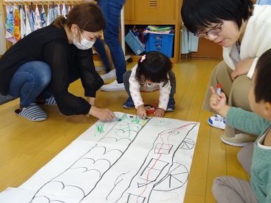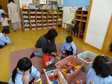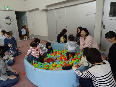 あちこちの遊びのコーナーで、園児がいる環境で行われる「さくらんぼ」を体験しました。