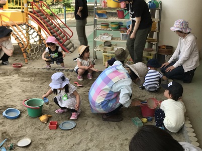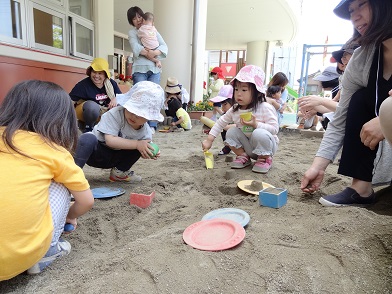 おやつの後 庭に出て、砂場や固定遊具などで、思い思いに遊びました。お母さんも一緒、先生と一緒、結構熱中していたようですよ。