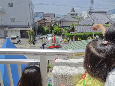 最後はみんなで紙芝居を見て解散となりました。 15日はベランダから「花祭りのパレード」を見ることができました。