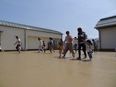今回の主な活動は園内巡り。屋上で元気にかけっこをしたり、先生と追いかけっこをしたりして遊びました。