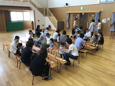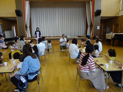 おやつの時間に自己紹介を行いました。初めて集まったところ、同じ地区の方が複数いらっしゃることがあり、後から話しが弾んだりもしていたようです。地域の子育て支援の一つである「さくらんぼ」で、親子共に新たなお友達作りをしていってください。