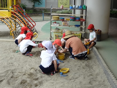 食後はおとうさん先生やおかあさん先生に遊んでいただきました。大好きなパパやママが「みんなの先生」で、ヤキモチよりも誇らしげでうれしい子どもたちです。