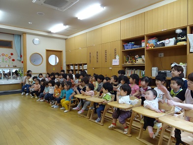未満児さんたちの集会です。0歳から満3歳のお友達が集まりました。手遊びをしたり、「こいのぼり」のうたを先生と一緒に歌ったりしました。