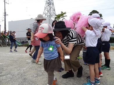 今回は「こいのぼり運動会」を間近に控えた園児の練習を見て、体操などに加わったり年少さんの電車ごっこを一緒に体験したり、こいのぼり拾いのかけっこをしたりする活動を行いました。