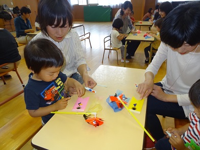 そしてこいのぼりにうろこを飾り、風車につけてもらいできあがりです。