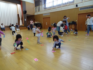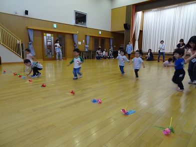 30日は天候がよくなかったので、遊戯室内でかけっこをしました。最初のかけっこは吹き流しのついた風車拾いです。