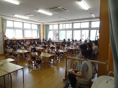 5日(火)は年少さくら組と年中うめ組・なでしこ組でした。さくら組は壁面を飾るあじさい作り。ハサミの活動に子どもたちも、見ている大人も真剣です。