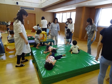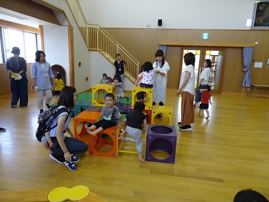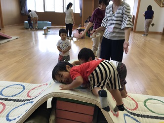 ゲームボックスをくぐったり、登ってマットに飛び降りてみたり、弾んでみたり・・・。それぞれの場所に子どもたちは全身で関わって楽しんでいました。