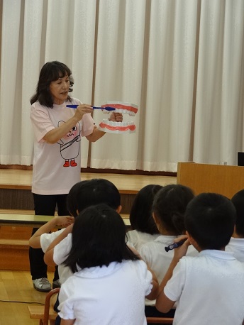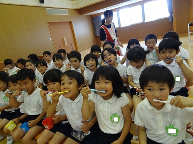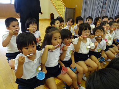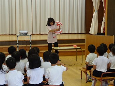 6月14日(木)の午後、飯田女子短期大学の安富先生の出前講座を受け、年長児が歯の大切さから噛むことの大切さ、そして歯磨き指導を受けました。
