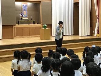 年少以上の子どもたちは遊戯室に集まり、園長先生のお話を聞いたり、プール遊びのための約束を確認したりしました。
