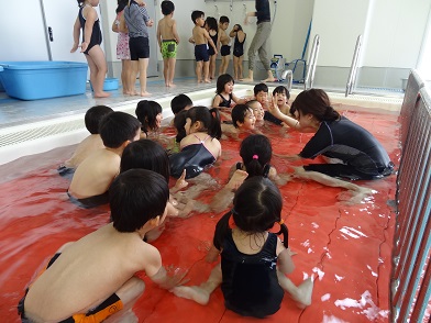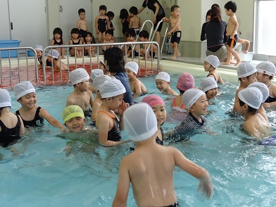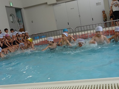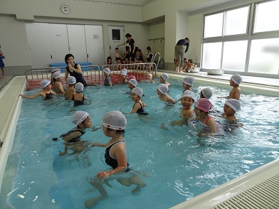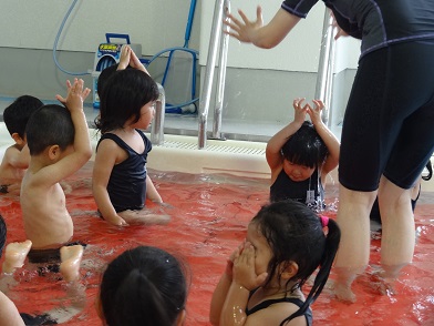 年中さんも深い方のプールを歩いたり、肩まで水につかったりしながら水に親しんでいました。