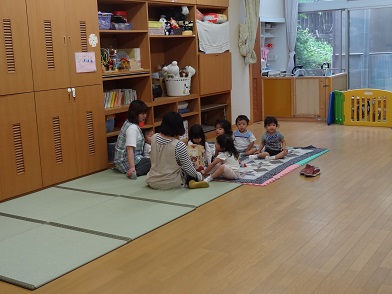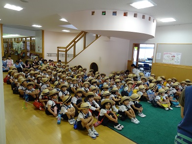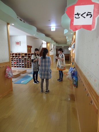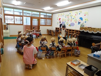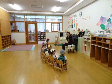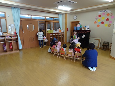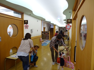 年少及び未満児は保育室にて保護者の迎えを待ち、年中・年長は正面玄関前フリースペースで待ちました。