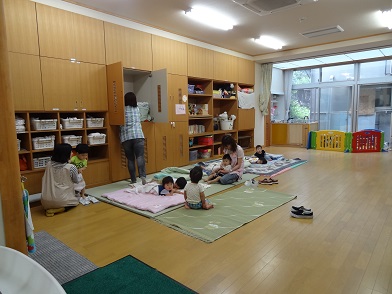 いつもと違う雰囲気がある中、絵本を見たり話をしたりしながら落ち着いて待てるように未満児の先生も配慮します。メールを受け、家や職場から保護者の方が迎えに来ます。年中・年長は正面玄関で引き渡し名簿に時刻や迎えに来た人を記入します。