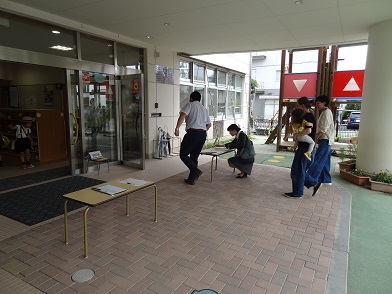 6月21日(金)、「梅雨前線停滞により、全市一帯に大雨警報が発令された」ということを想定して、保護者協力のもと「園児引き渡し訓練」が行われました。