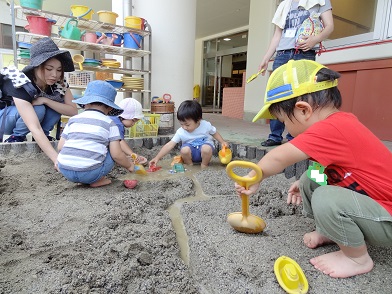 今回は砂場遊びを計画。火曜日は元気いっぱい遊べましたが、水曜日は天候に恵まれず砂場で遊ぶことはできませんでした。