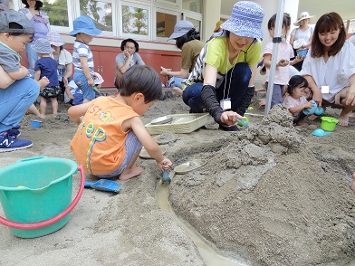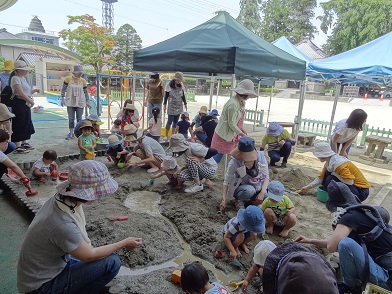 裸足になってどろんこや水で思い切り遊びます。おかあさん方も皆さん一緒に砂場で遊んでくださり、大きな川や山もできました。