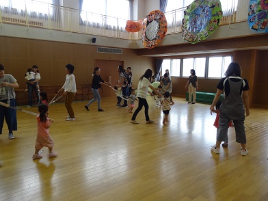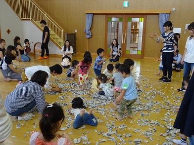 火曜日の新聞紙遊び。はじめは細長くした新聞紙をひらひらさせたり、つなげて長くしたものを捕まえようとしたり、親子で電車ごっこしたりしていましたが、砂場で遊べない分、思い切り新聞紙をばらまいて全身で遊びました。点検通路の高いところから降らせてあげると、歓声が一番大きくなりました。