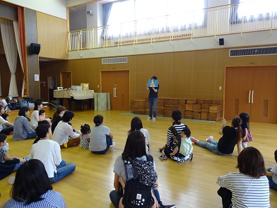 最後に紙芝居の時間。たくさん遊んだので、みんなおかあさんのお膝で上手に見てくれました。