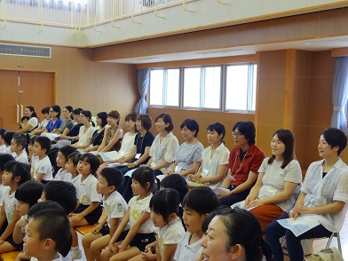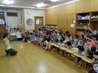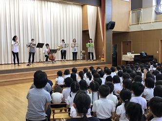 今月のアトラクションは「マミーナアンサンブル」の方々による、ミニコンサートでした。様々な楽器の音色を楽しんだり、子どもたちにとって身近な曲を聞いたりしました。1曲「展覧会の絵 よりプロムナード」を聴き、感動していた子どもたちでした。