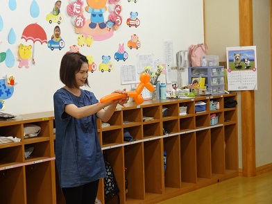 アトラクションは風船を使ったパフォーマンス。長い風船を、ひねったりくっつけたりしながら動物や花ができていきます。魔法のような先生の手に、子どもたちも驚いたように見入っていました。