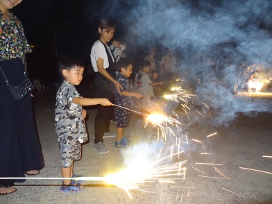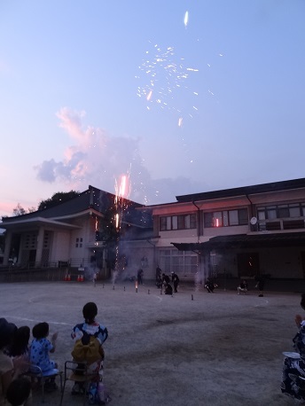 最後にみんなで「夕焼けこやけ」を歌い、午後8時には終了して帰宅しました。後片付けを済ませたお父さん委員とボランティアkお父さん方、お疲れ様でした。しとても良い花火大会をありがとうございました。