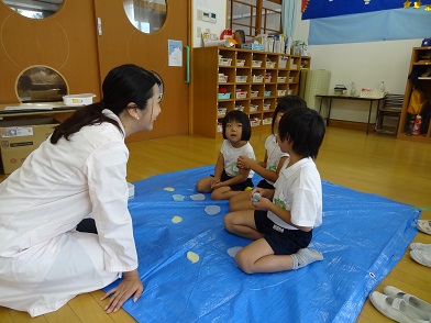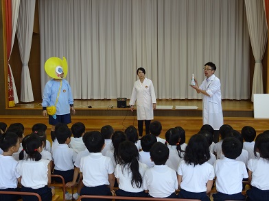 7月19日(木)、日本細菌検査株式会社の手洗いプロジェクトチームの皆さんにお越しいただき、年長さん対象に「ぷーの手洗い教室」がありました。