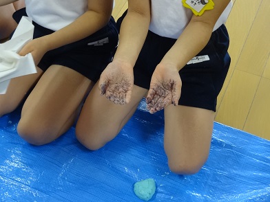 その後、各保育室で粘土をこねてみて、一見汚れていないように見える手が、実際にはどのくらい汚れているか魔法の水をかけて一人ずつ体験してみました。