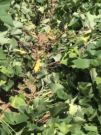 サツマイモの苗は青々と伸び、畑一面に広がっていました。土が見えない畑の内側を少し広げてみると、1本の苗から蔓がぐんぐんと伸びて一面に広がっている様子がわかりました。